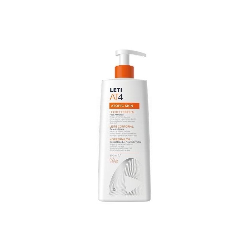 Leti At-4 Leche Corporal es una emulsión fluida de fácil aplicación y un alto poder emoliente. Se trata de una leche corporal perfecta para aplicar en zonas corporales extensas. Está indicado para todo tipo de personas, bebés, niños y adultos que tengan pieles atópicas, secas y sensibles.